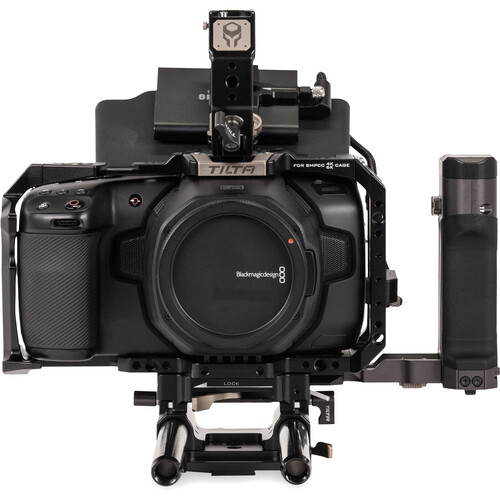 The tactical gray Tilta Full Camera Cage for Blackmagic Design Pocket Cinema Camera 4K/6K is a multipart, formfitting cage that you assemble to protect your Blackmagic Pocket Cinema Camera, either the 4K or 6K version. Once the cage is assembled, it holds your camera securely via attachment points at the top and bottom.