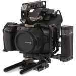 The black Tiltaing BMPCC 4K/6K Cage Advanced Kit from Tilta features a protective full cage and a 15mm LWS baseplate system with a pair of 7.9″ rods for mounting accessories. This kit also includes an SSD holder for a Samsung T5 SSD, a quick release top handle, a rubber side handle, a 90° USB Type-C cable, and a half sunshade.